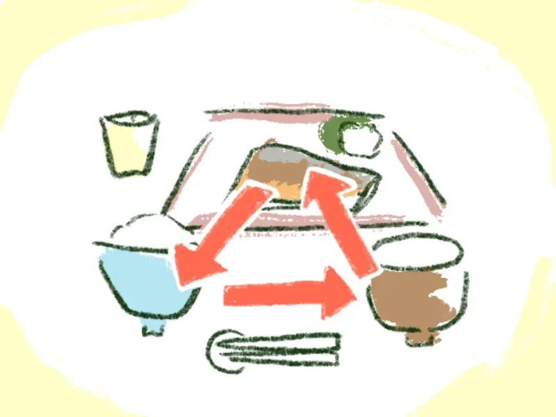 Questa disposizione non è solo estetica, ma anche pratica. Permette di seguire l'ordine tipico dei bocconi, il cosiddetto 三角食べ (sankaku-tabe), o "mangiare a triangolo": si prende un boccone di riso, poi un sorso di zuppa, poi un po' di contorno, e si ricomincia, alternando continuamente i sapori in un ciclo armonioso. È anche per questo che le ciotole di riso e zuppa si sollevano (椀は手に持つ, wan wa te ni motsu): tenerle in mano facilita questo movimento triangolare e, come abbiamo visto, è un segno di profondo rispetto per il cibo.